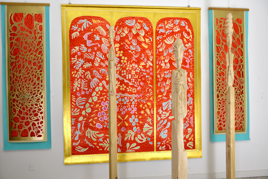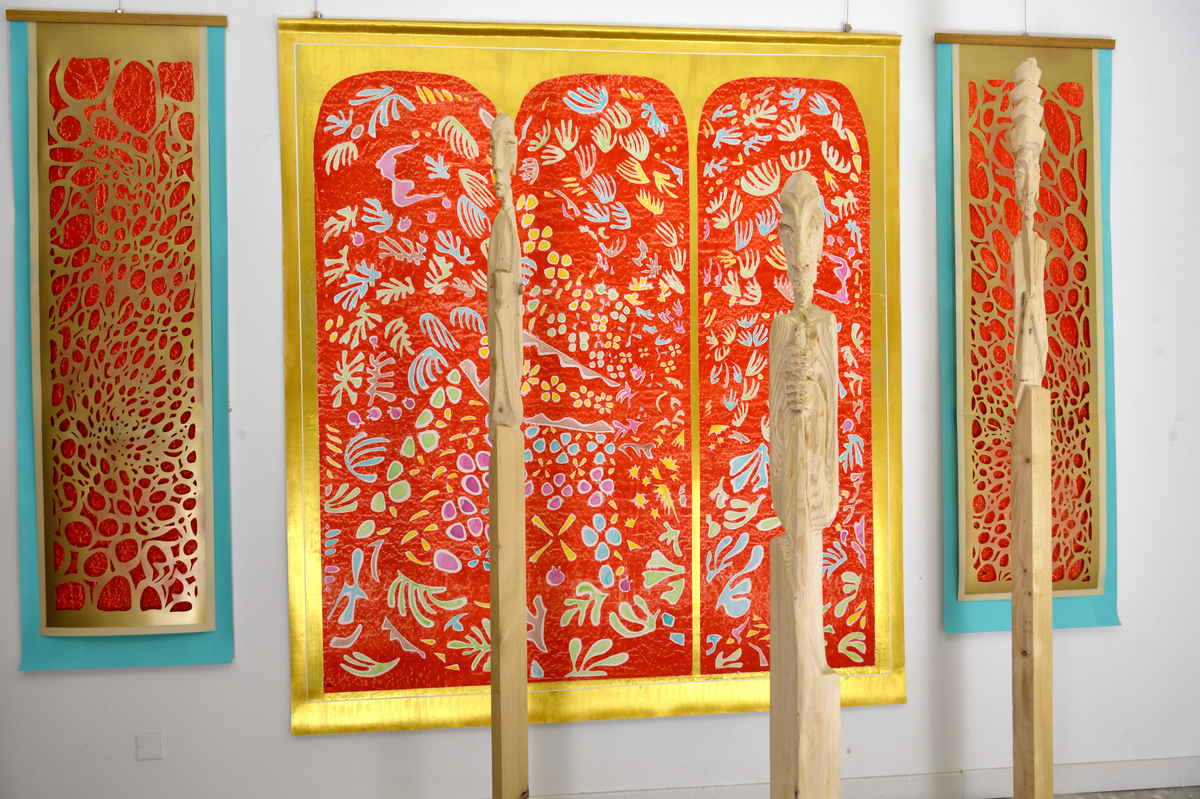 Achao and Lars Von KFL, sculptor, unite their worlds to create installations where painting and sculpture intertwine. Achao's canvases, with their organic and soothing patterns, respond to Lars' wooden silhouettes—streamlined, fragile, as if suspended in time. Together, they transform the space into a realm of silence and presence, an invitation to introspection. Each work becomes a point of anchorage for reflection. Visitors are invited to pause, to listen to the inner echo evoked by the shapes and colors, and to immerse themselves in an experience of calm and contemplation.