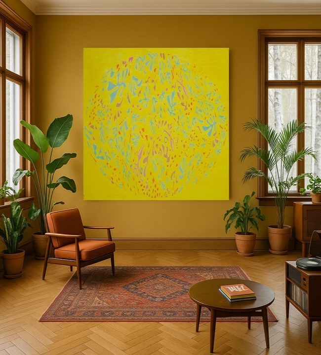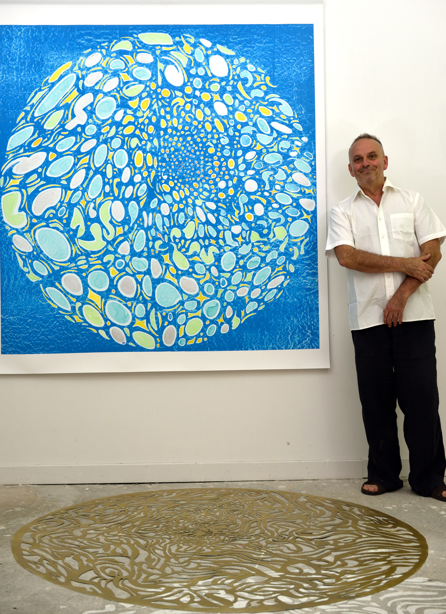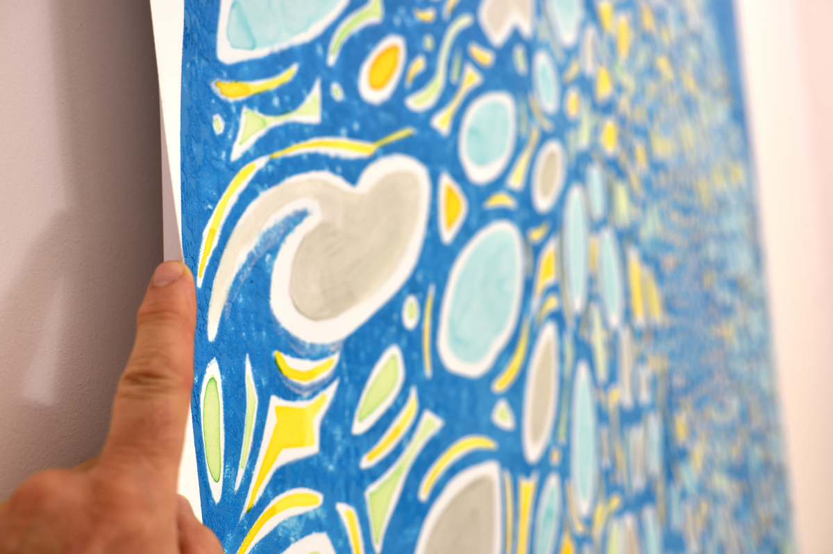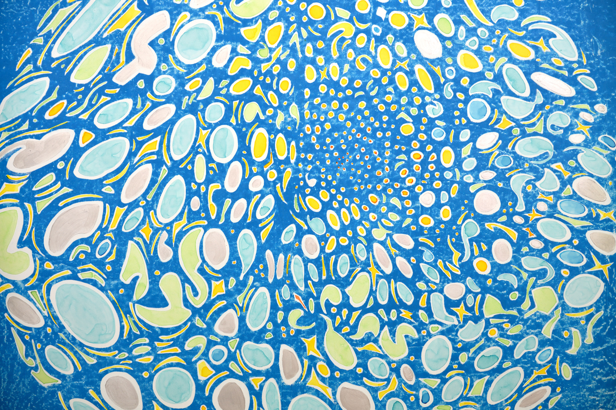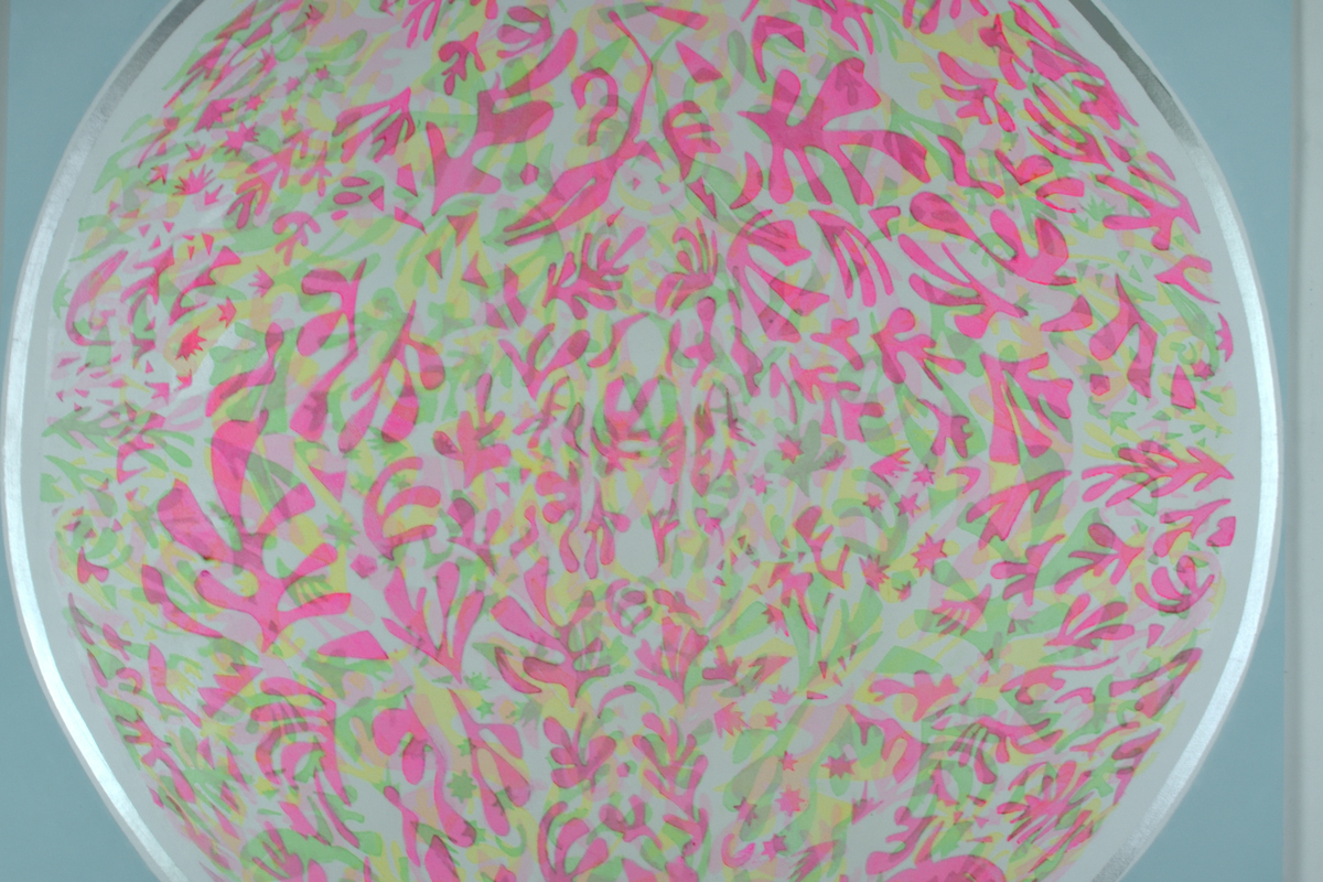 The Mandalas of Achao focus on the central circle, a symbolic heart of fullness and energetic flow. Its pure motifs—bubbles, interlaced lines—draw a path towards calm and introspection. Drawing from Buddhist tradition and the formal freedom of Matisse's cut-out papers, the artist unfolds a work that is both contemplative and vibrant, infused with positive energy. These compositions, often large in scale, act as portals to a regained serenity. The viewer is invited to follow the outline of the forms, like a visual dance between abstraction and tangible presence. A work that invites a pause, a breath, and a return to the essential.