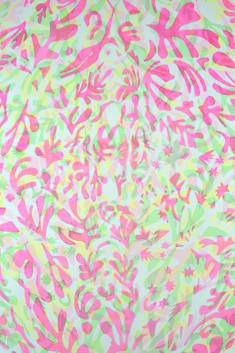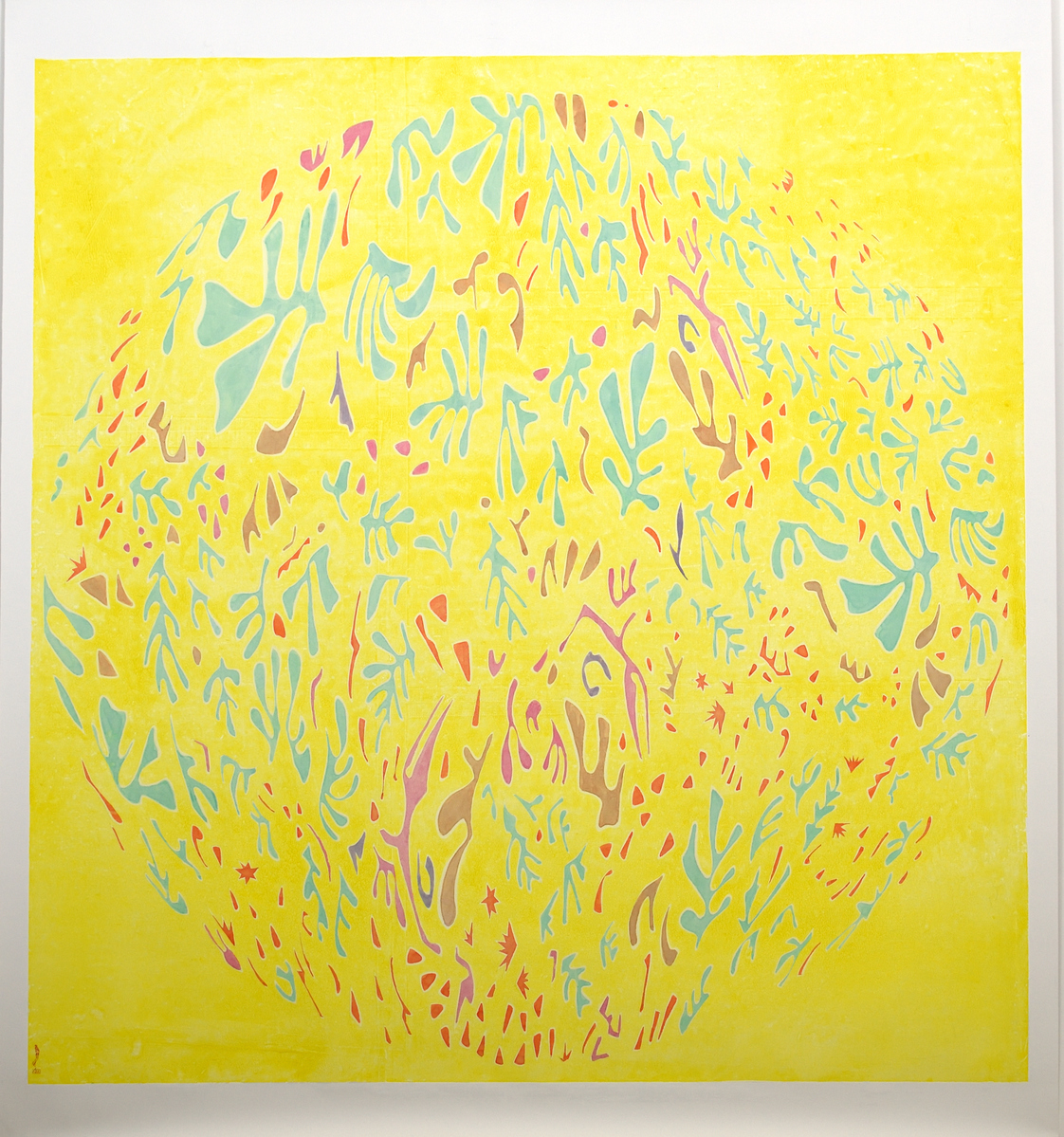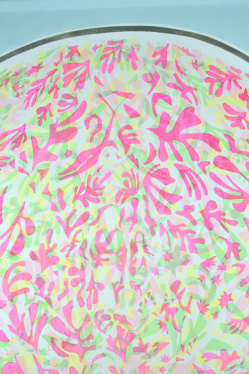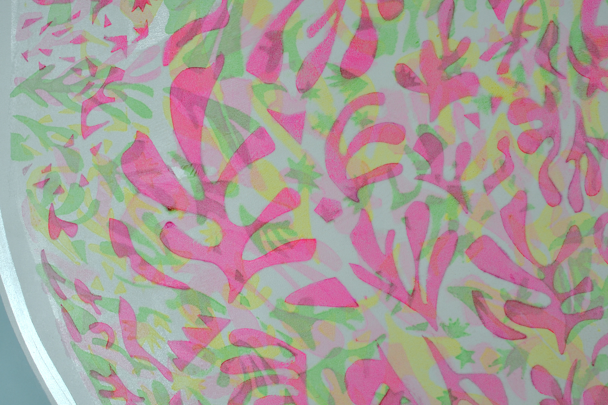 The Mandalas of Achao focus on the central circle, a symbolic heart of fullness and energetic flow. Its pure motifs—bubbles, interlaced lines—draw a path towards calm and introspection. Drawing from Buddhist tradition and the formal freedom of Matisse's cut-out papers, the artist unfolds a work that is both contemplative and vibrant, infused with positive energy. These compositions, often large in scale, act as portals to a regained serenity. The viewer is invited to follow the outline of the forms, like a visual dance between abstraction and tangible presence. A work that invites a pause, a breath, and a return to the essential.