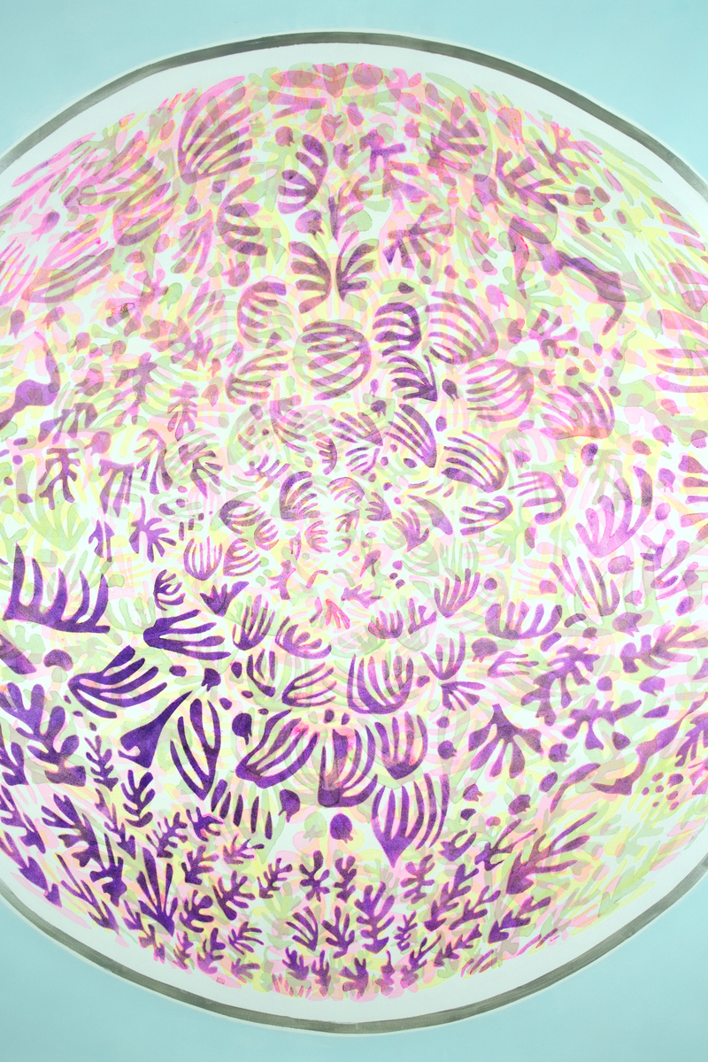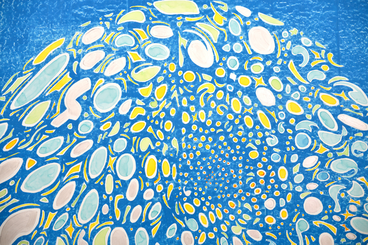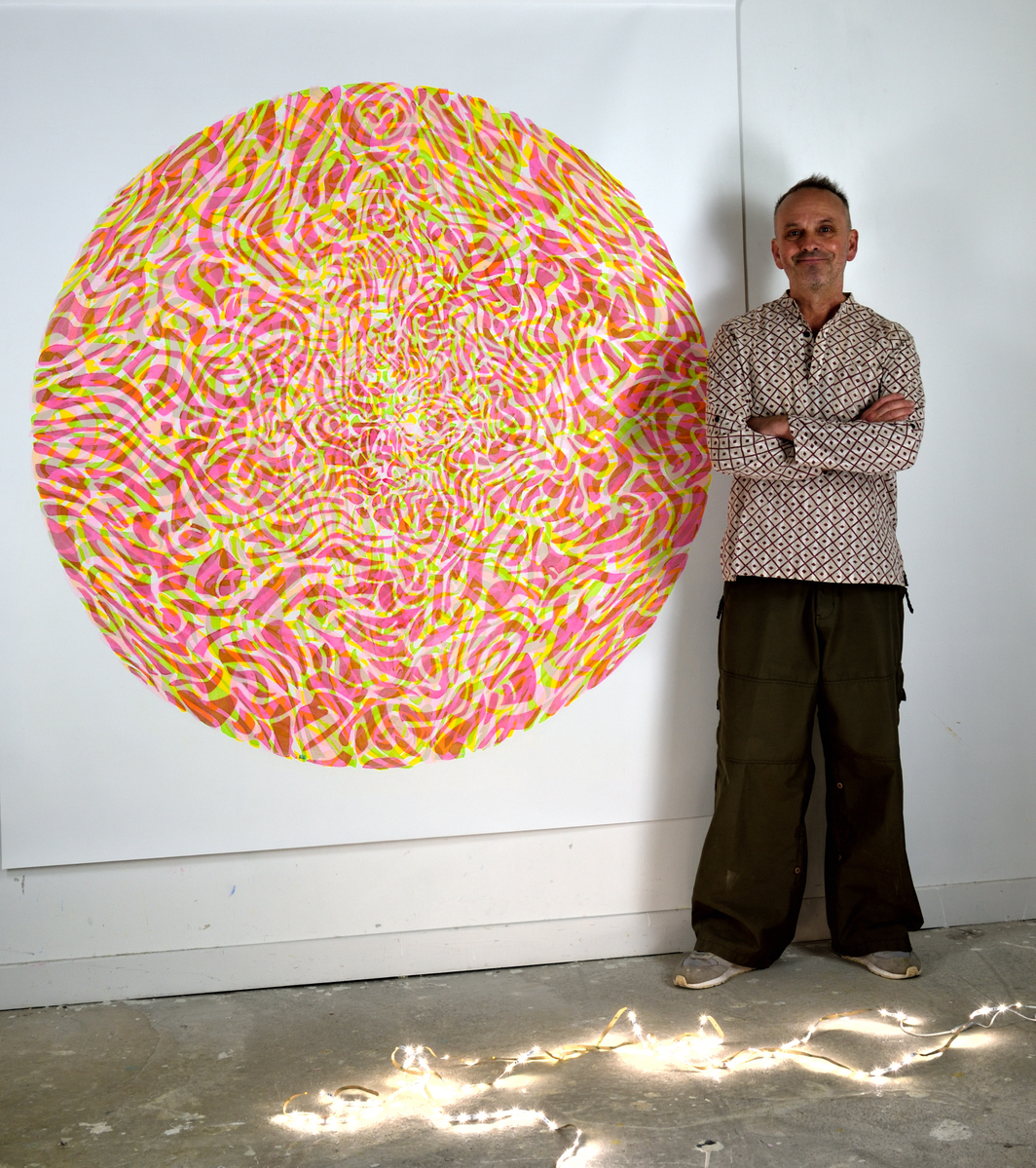The Mandalas of Achao focus on the central circle, the symbolic heart of fullness and energy flow. Its pure motifs—bubbles, interlacing lines—draw a path toward calmness and introspection. Drawing from Buddhist tradition and the formal freedom of Matisse's cut-out papers, the artist unfolds a work that is both contemplative and vibrant, charged with positive energy. These compositions, often large in scale, act as portals to a rediscovered serenity. The viewer is invited to follow the outline of the shapes, like a visual dance between abstraction and tangible presence. A work that invites a pause, a breath, and a return to the essential.