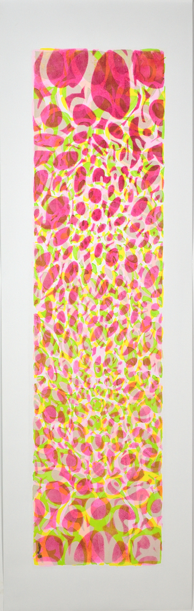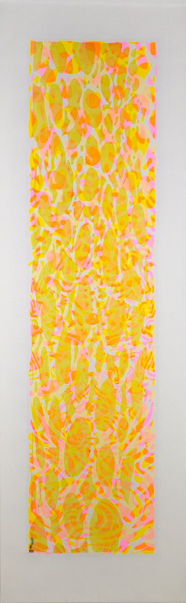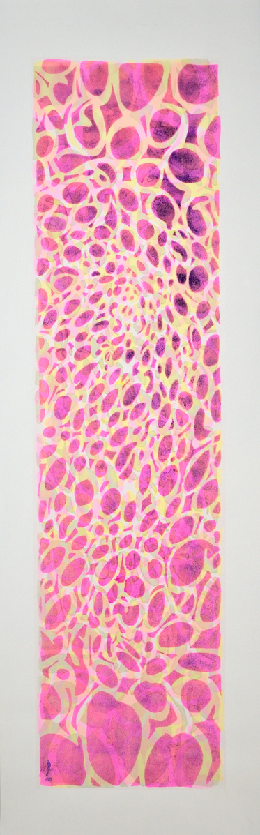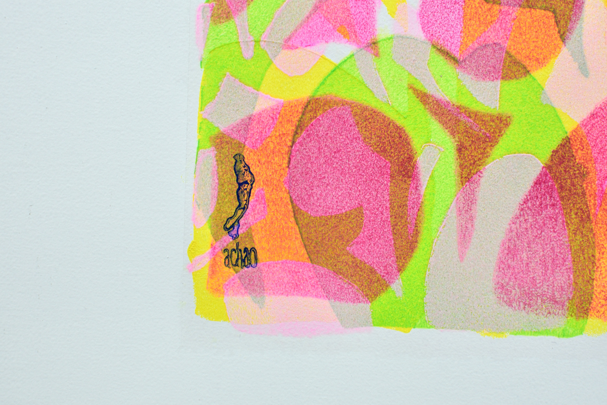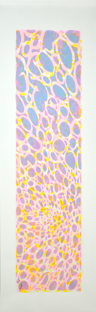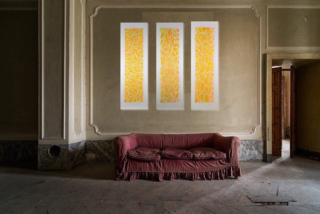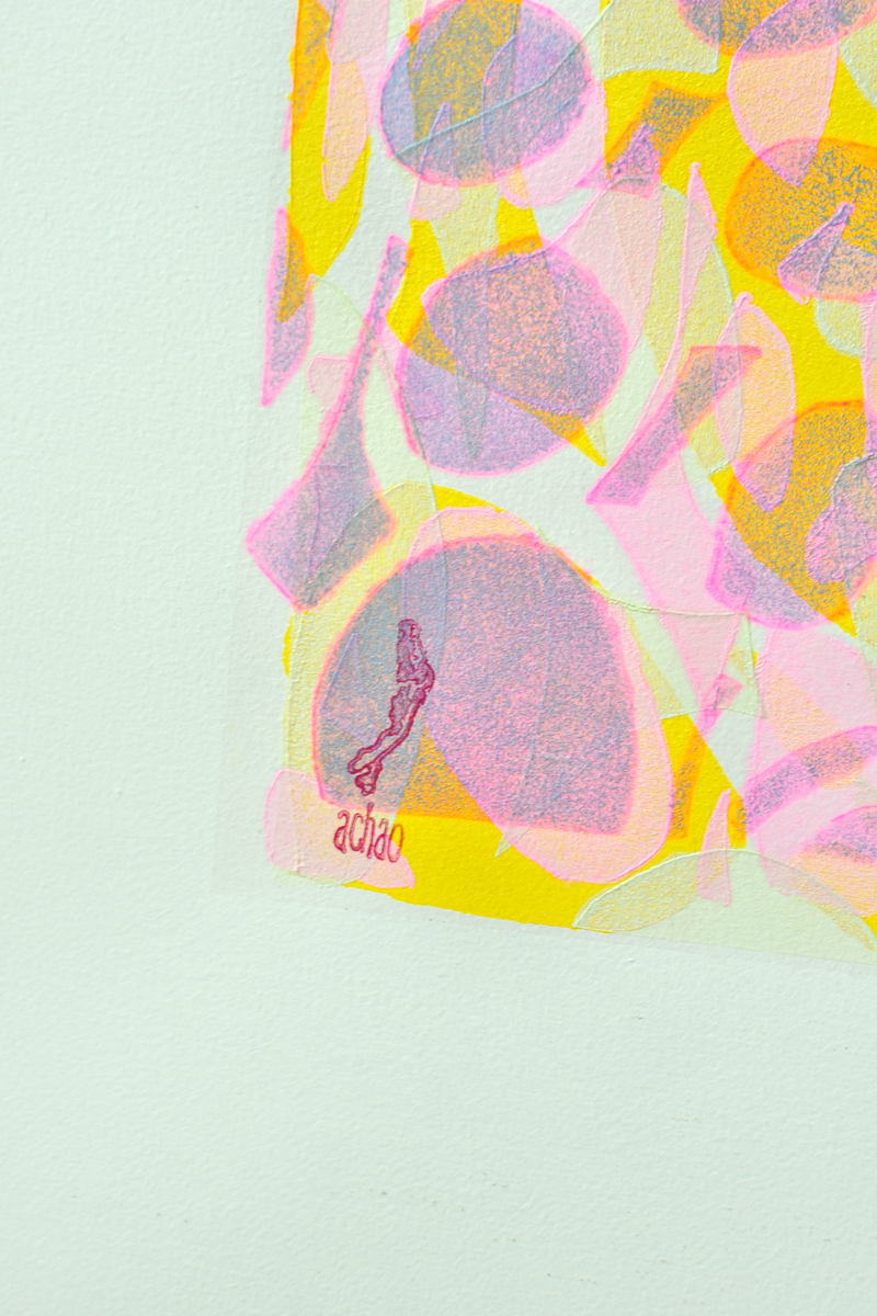 In the Vâhana series, Achao draws from the Hindu symbolism of the "vehicle of the gods" to create vertical canvases, true pathways leading to spiritual elevation. The motifs — bubbles and interwoven lines — unfold in a visual ascent. Light and airy, these works seem to float, freeing the gaze and imagination towards unsuspected heights. Each piece, with its elongated format and play of transparency, becomes an offering, a bridge between the tangible and the invisible. Here, the color and rhythm of the shapes transcend space, inviting a new perception of the sacred and the infinite.