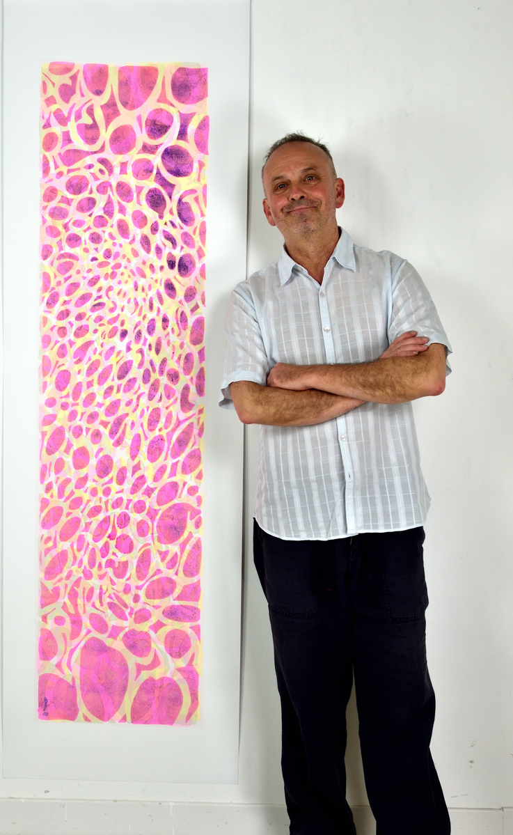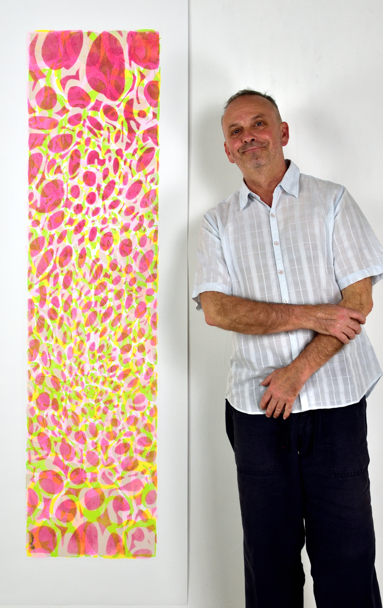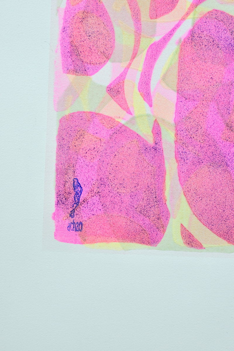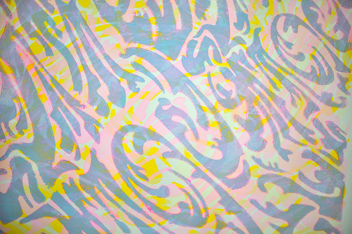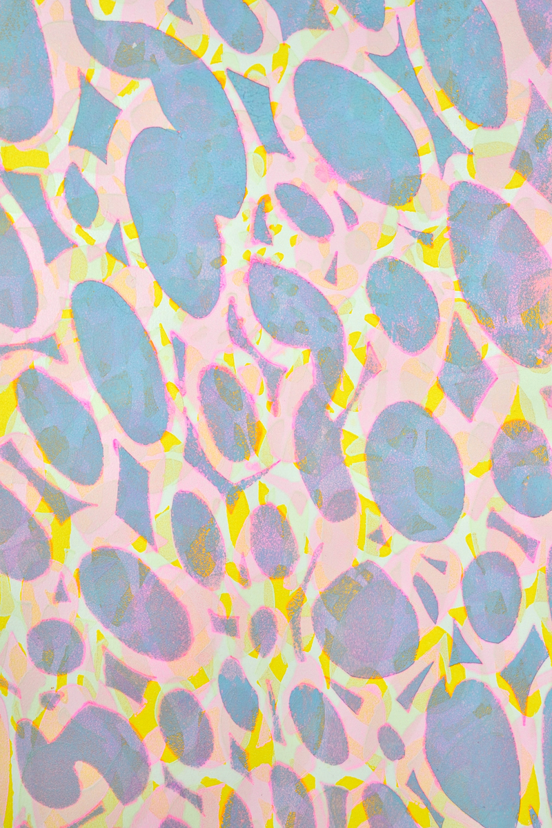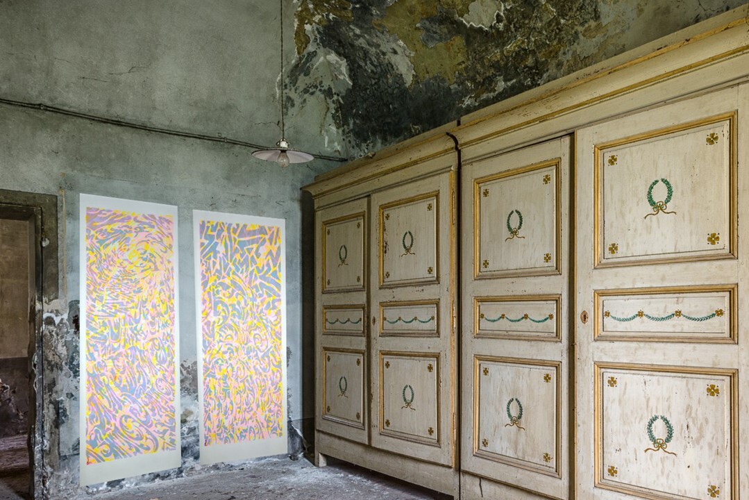 In the Vâhana series, Achao draws from the Hindu symbolism of the "vehicle of the gods" to create vertical canvases, true pathways leading to spiritual elevation. The motifs — bubbles and interwoven lines — unfold in a visual ascent. Light and airy, these works seem to float, freeing the gaze and imagination towards unsuspected heights. Each piece, with its elongated format and play of transparency, becomes an offering, a bridge between the tangible and the invisible. Here, the color and rhythm of the shapes transcend space, inviting a new perception of the sacred and the infinite.