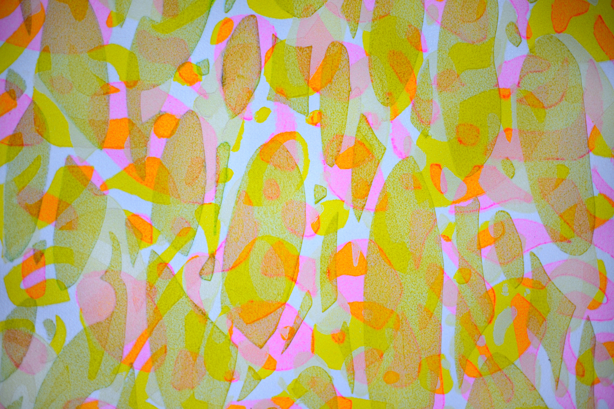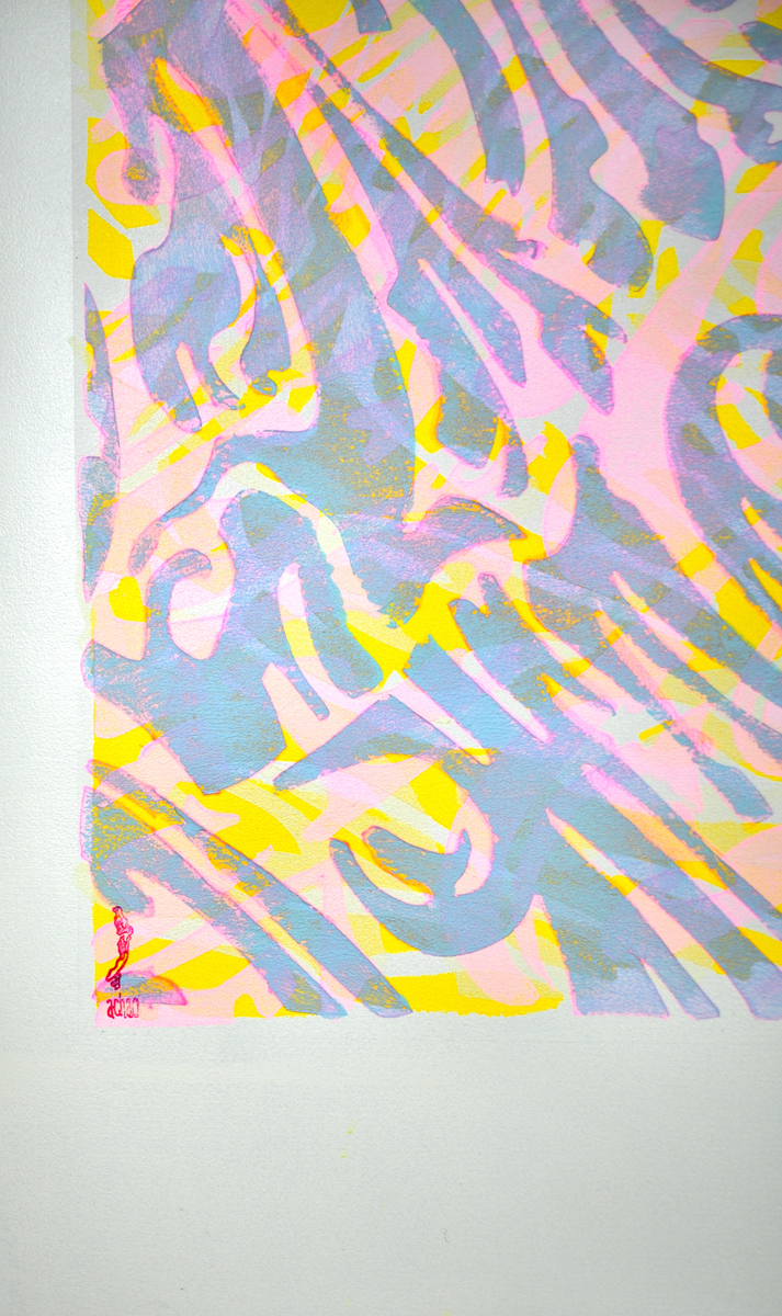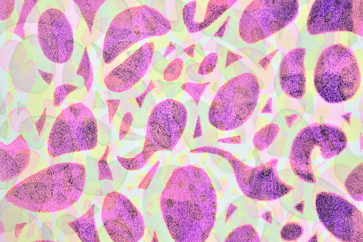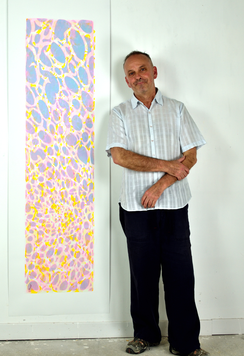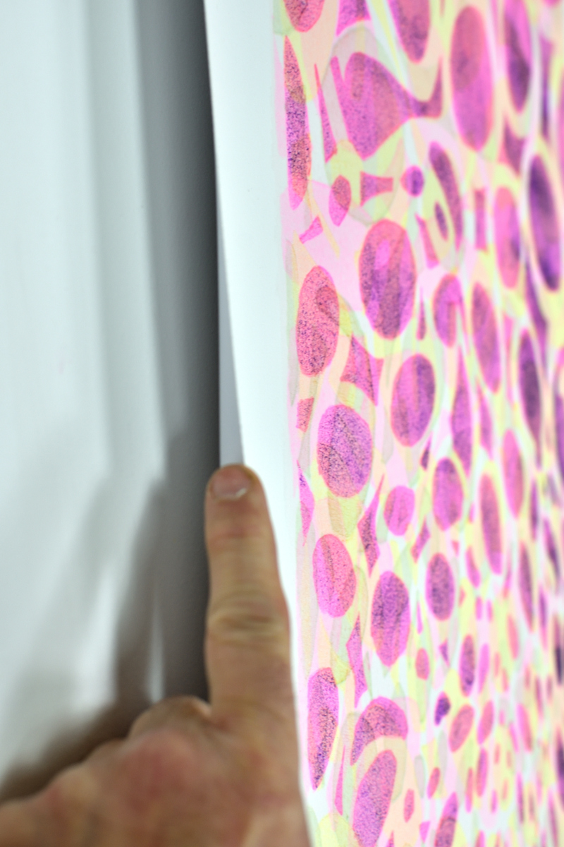 In the Vâhana series, Achao draws from the Hindu symbolism of the "vehicle of the gods" to create vertical canvases, true pathways leading to spiritual elevation. The motifs — bubbles and interwoven lines — unfold in a visual ascent. Light and airy, these works seem to float, freeing the gaze and imagination towards unsuspected heights. Each piece, with its elongated format and play of transparency, becomes an offering, a bridge between the tangible and the invisible. Here, the color and rhythm of the shapes transcend space, inviting a new perception of the sacred and the infinite.