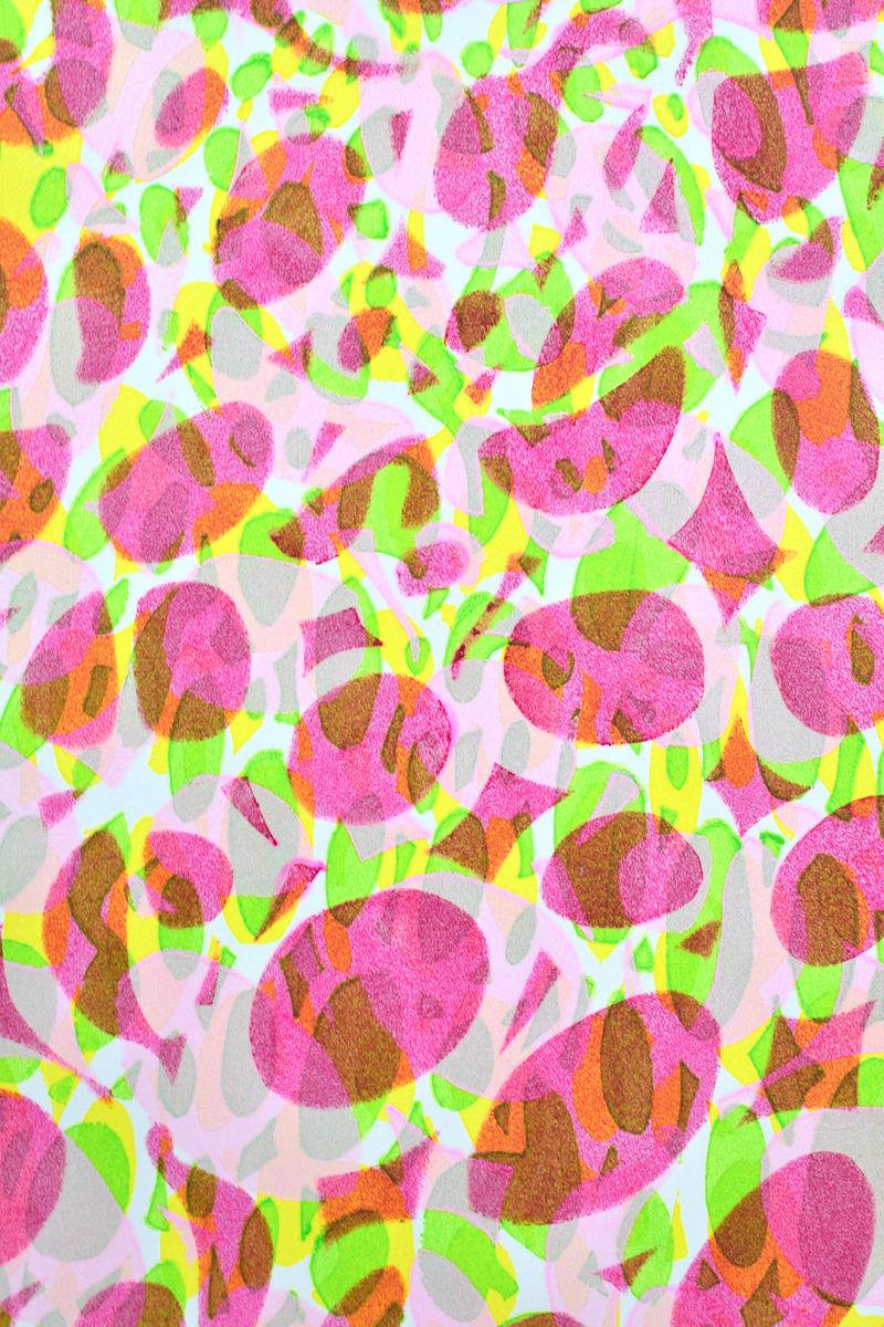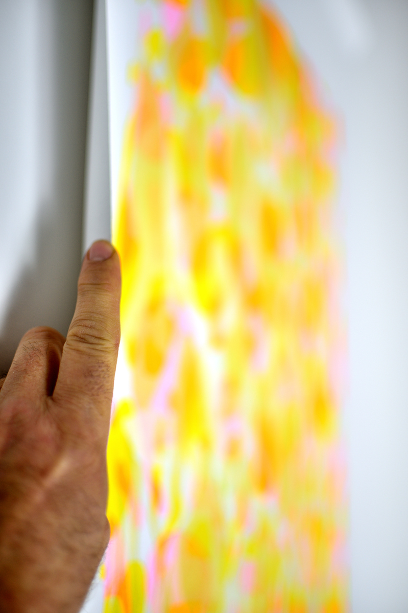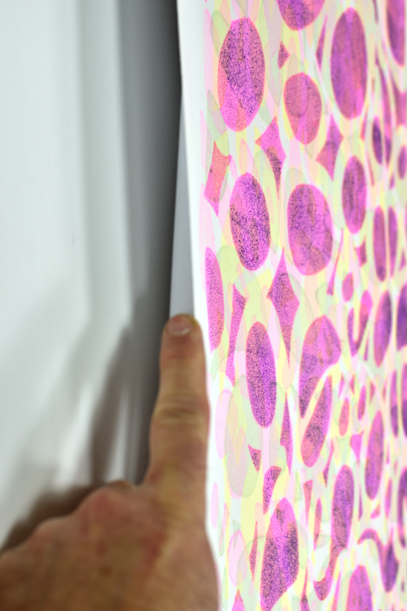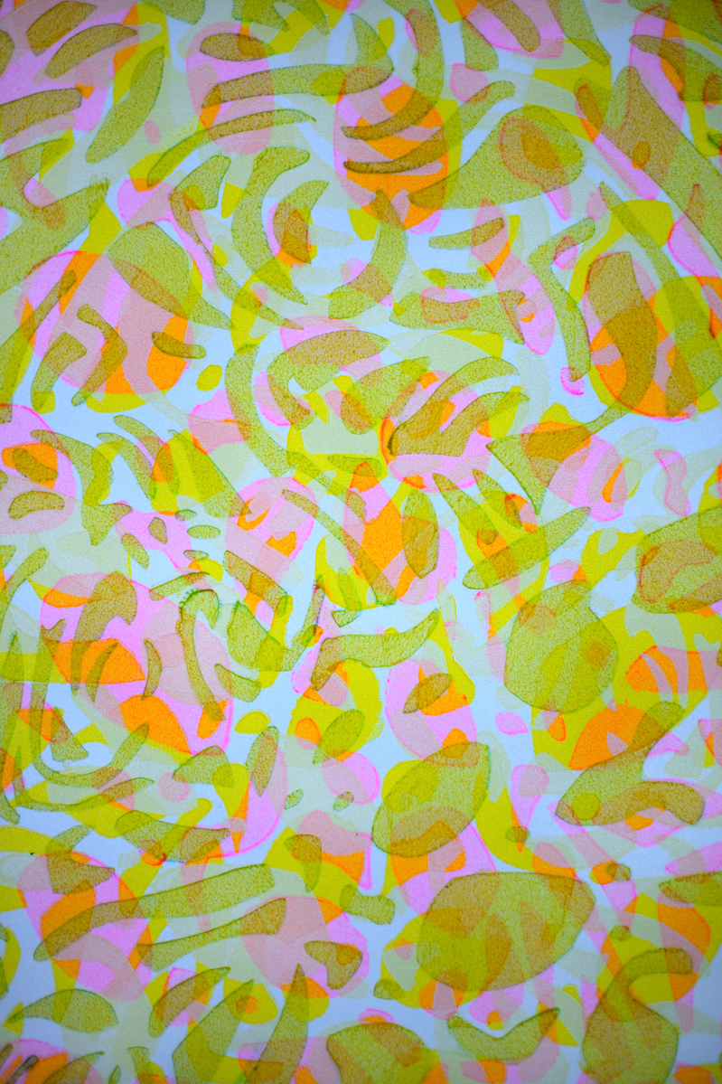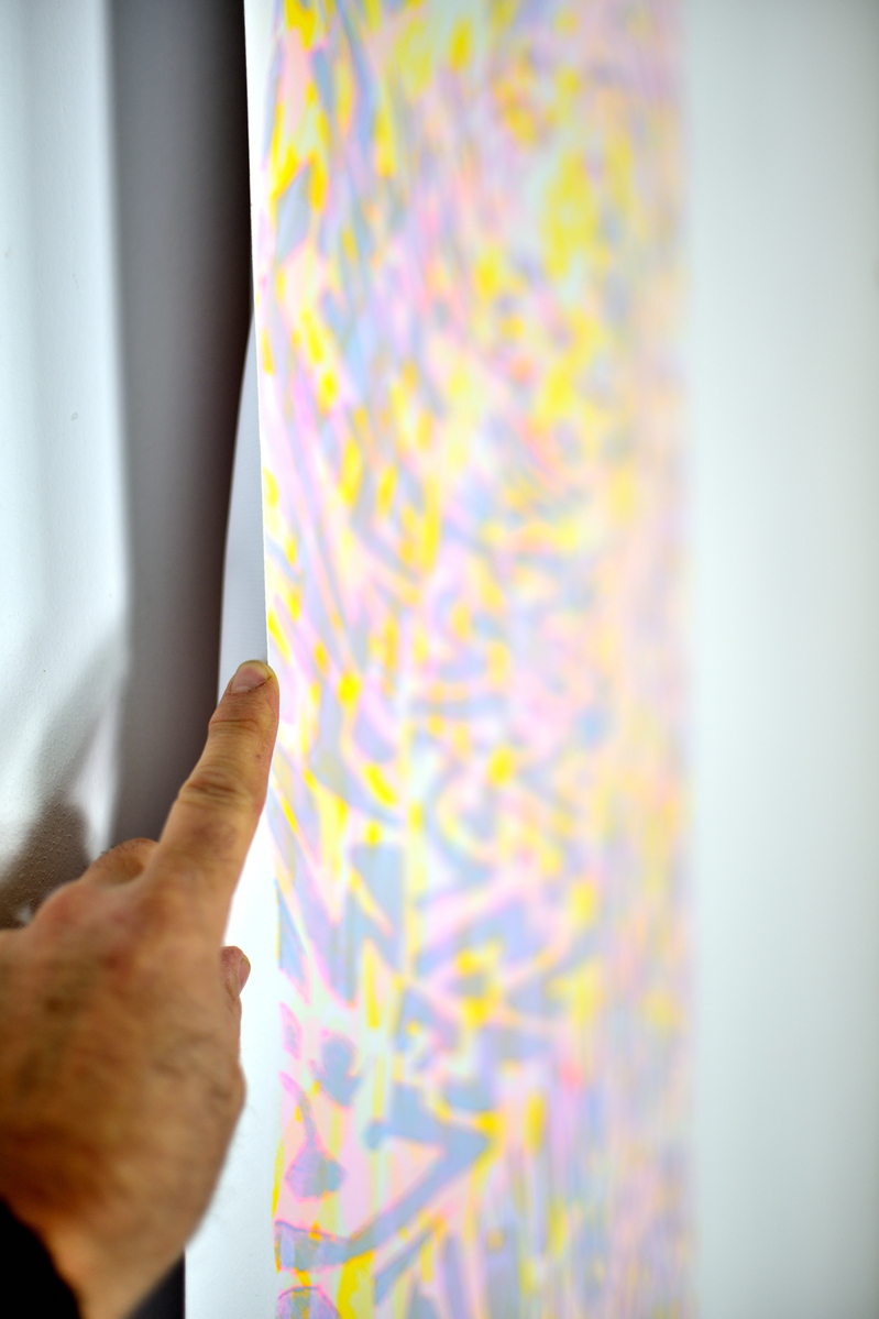 In the Vâhana series, Achao draws from the Hindu symbolism of the "vehicle of the gods" to create vertical canvases, true pathways leading to spiritual elevation. The motifs — bubbles and interwoven lines — unfold in a visual ascent. Light and airy, these works seem to float, freeing the gaze and imagination towards unsuspected heights. Each piece, with its elongated format and play of transparency, becomes an offering, a bridge between the tangible and the invisible. Here, the color and rhythm of the shapes transcend space, inviting a new perception of the sacred and the infinite.